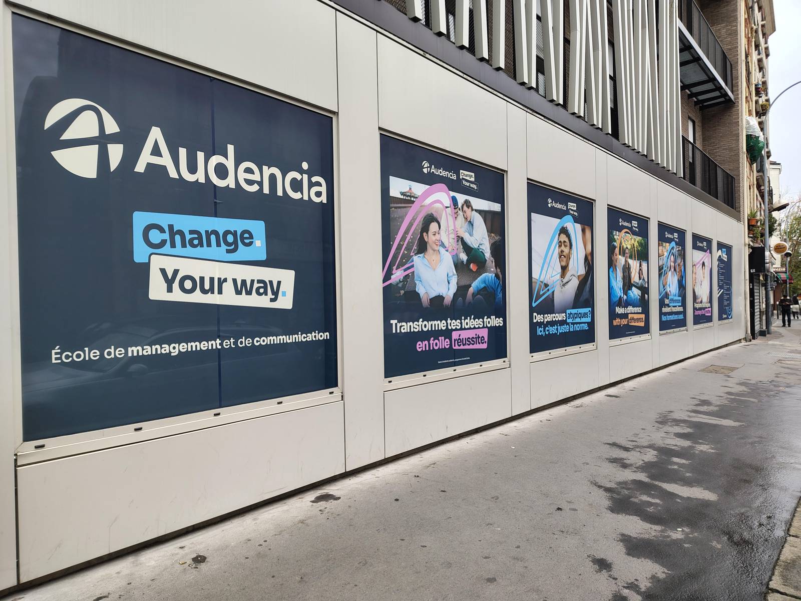 Notre société ADLUM a réalisé l’habillage en vitrophanie extérieure du campus provisoire Audencia à Paris. Sept visuels micro-perforés, slogans inspirants et identité graphique forte offrent une façade visible, moderne et cohérente, affirmant la présence de l’école et valorisant son image dans le quartier.